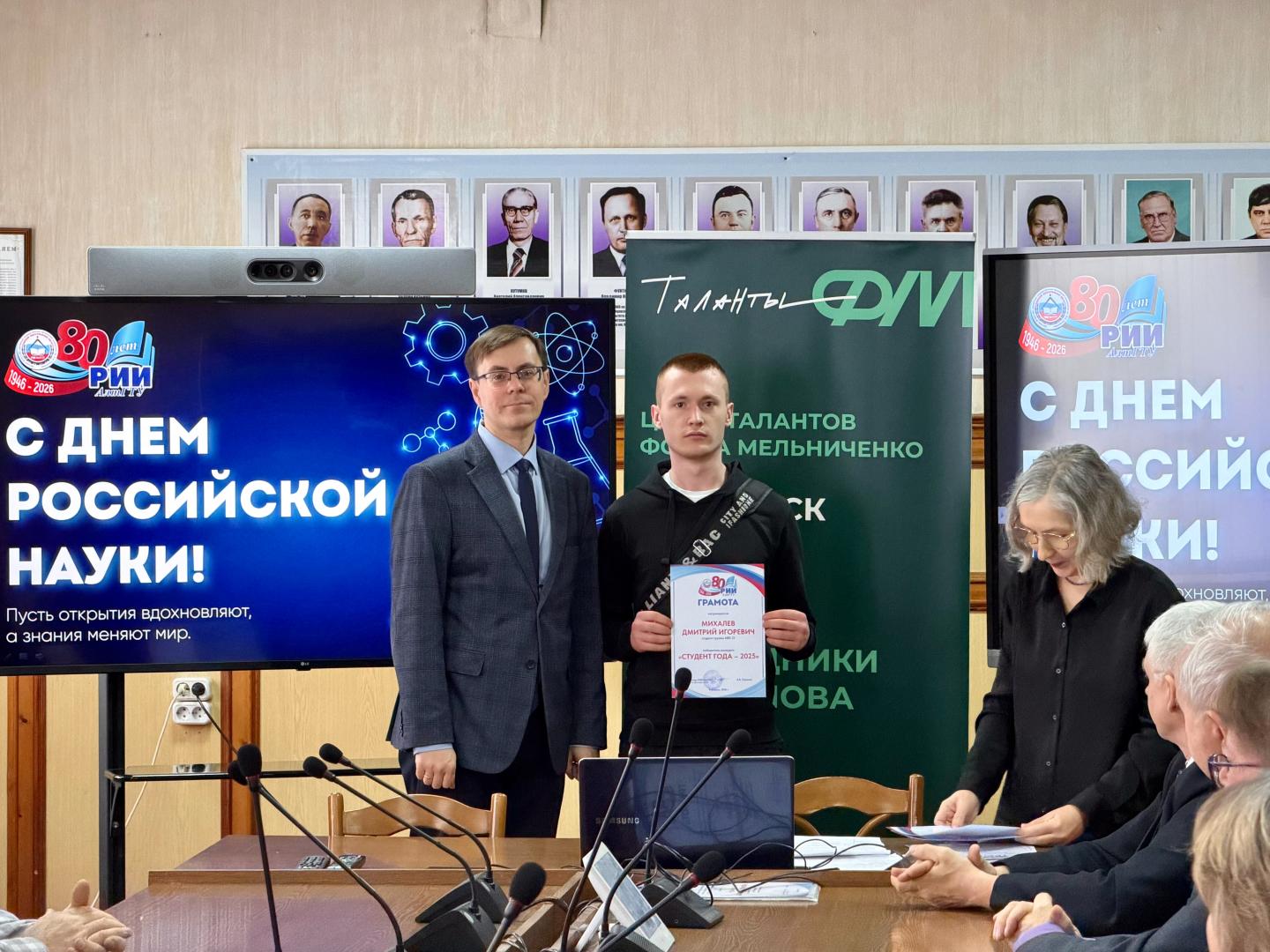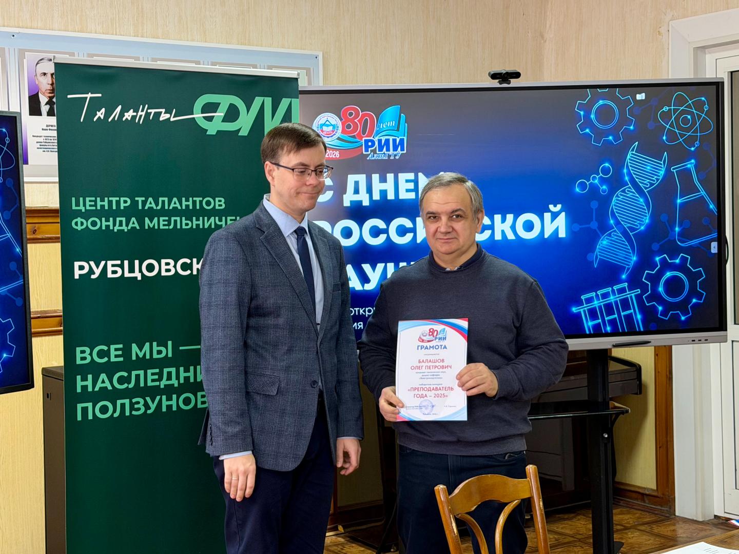 В ходе поздравлений на торжественном собрании и.о. заместителя директора по научному и инновационному развитию РИИ АлтГТУ Наталья Анатольевна Чернецкая вручила грамоты научно-педагогическими работниками за добросовестный труд и активное участие в научно-исследовательской и инновационной деятельности по итогам 2025 года, за добросовестный труд и высокую публикационную активность по итогам 2025 года, за добросовестный труд и активное привлечение студентов к участию в научных исследованиях, проектной деятельности и конференциях и в связи с празднованием Дня российской науки. Также награды получили студенты за стремление к научным достижениям и активное участие в научно-исследовательской работе по итогам 2025 года и в связи с празднованием Дня российской науки.