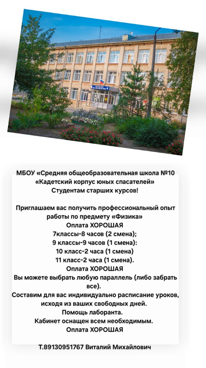 МБОУ "Средняя общеобразовательная школа №10 "Кадетский корпус юных спасателей" приглашает получить профессиональный опыт работы по предмету "Физика"