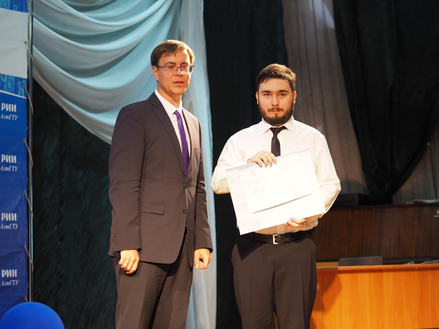 Исполняющий обязанности директора РИИ АлтГТУ, к.э.н., доцент  Антон Витальевич Сорокин лично вручил красные дипломы выпускникам и поздравил всех выпускников с окончанием обучения, пожелал занять достойное место в жизни, никогда не останавливаться на  достигнутом,  расти, развиваться и стремиться к новым знаниям.